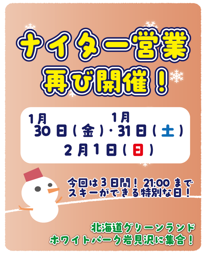 ● 1/30(金) 31(土)、2/1(日)は、ナイター営業を実施します。 2026年1月25日 最終更新日時 : 2026年1月25日 山本飛鳥 1/30(金) 31(土)、2/1(日)は、ナイター営業を実施します。●営業時間 9:00~21:00●運行リフト 1号のみ皆様のご来場、心からお待ちしております。