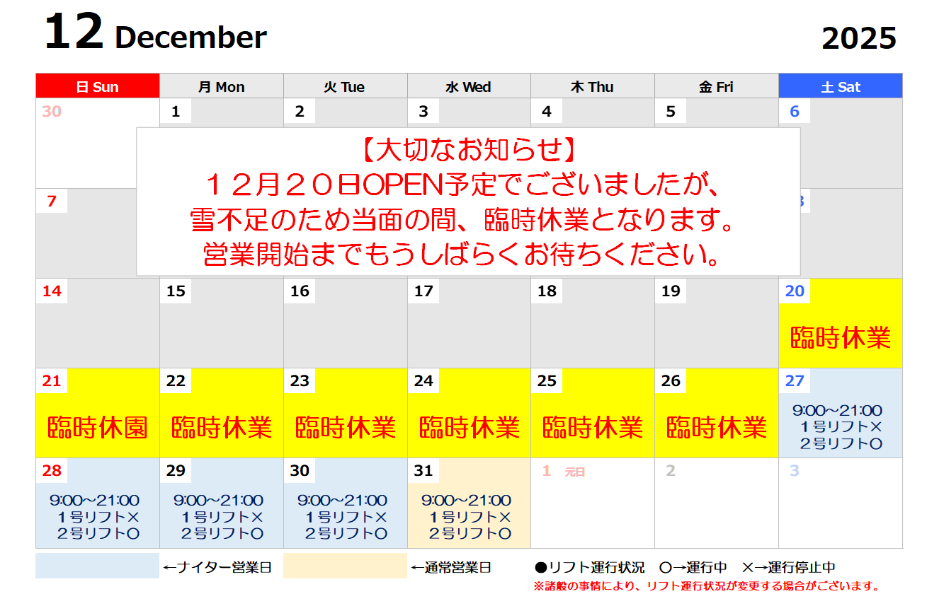 12月25日(水)は整備点検の為、1号リフトが運行休止となります。