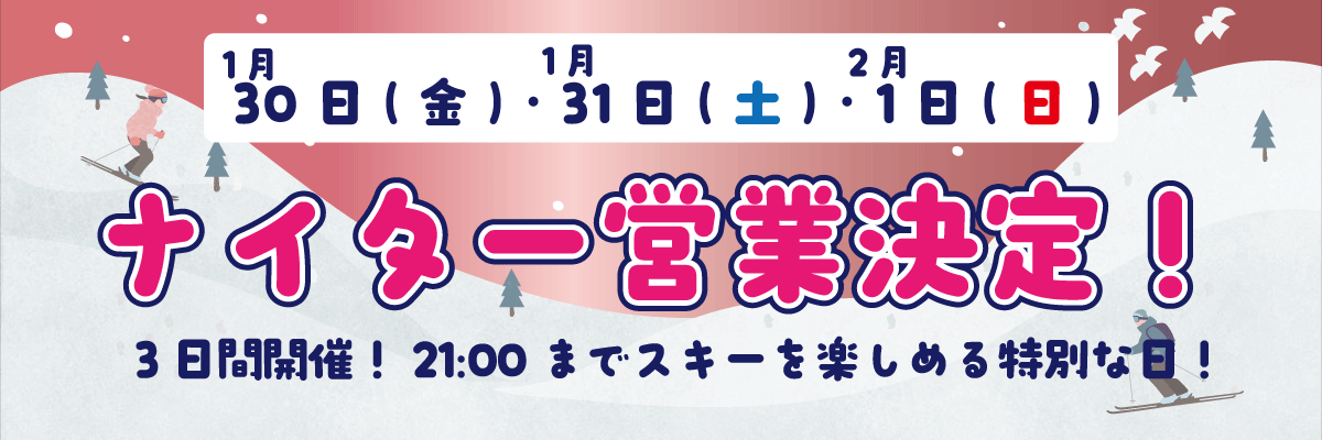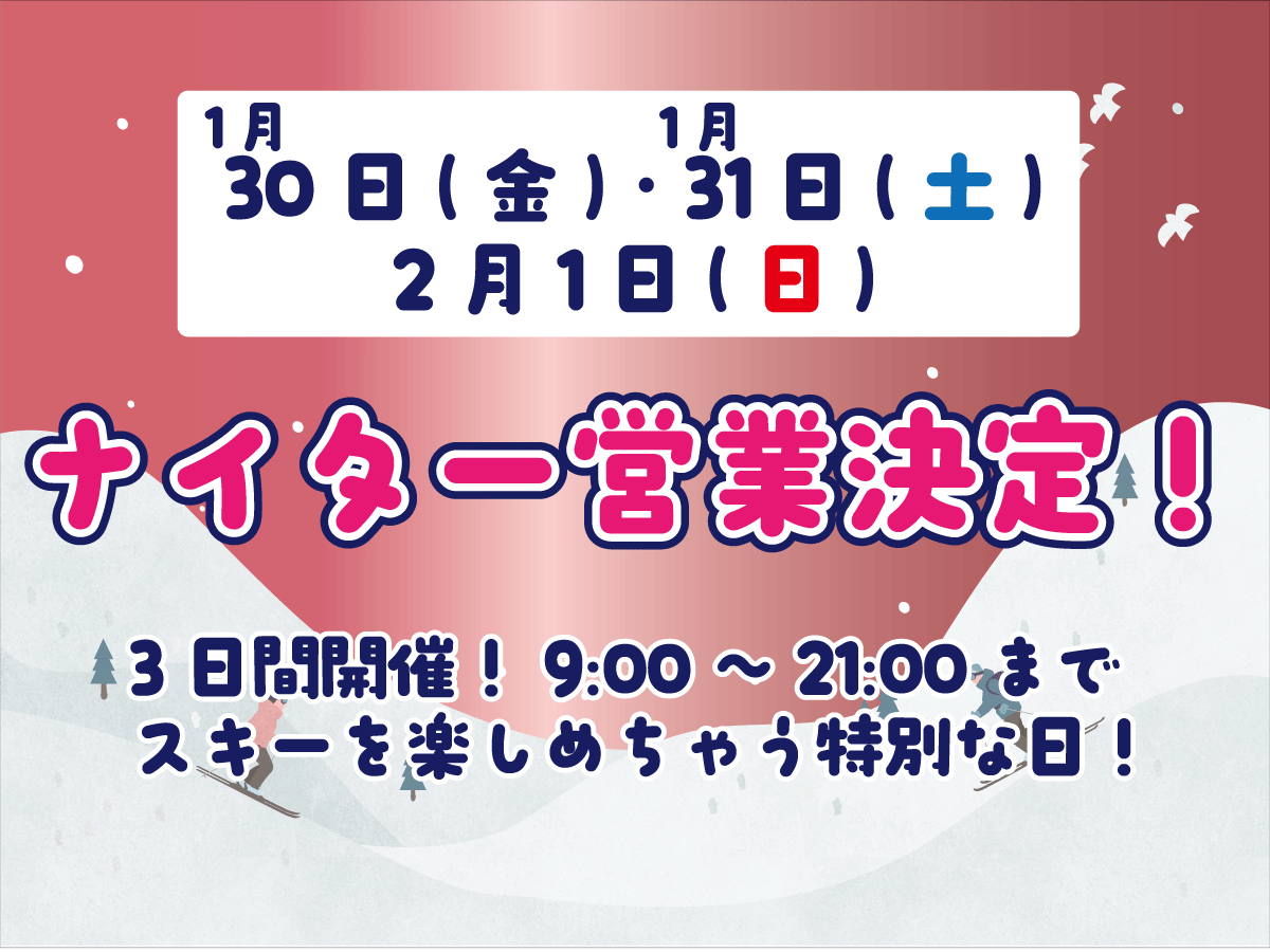 1/30(金) 31(土)、2/1(日)は、ナイター営業を実施します。
